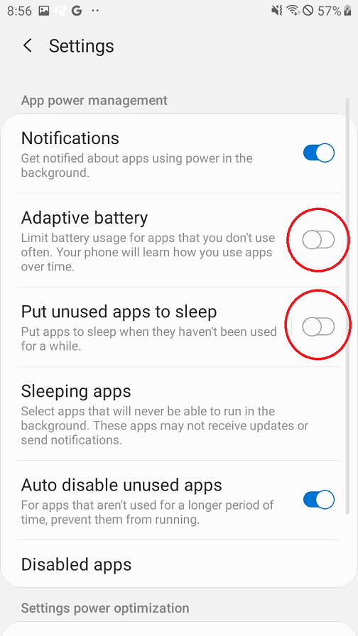 5. disable Adaptive battery and Put unused apps to sleep.