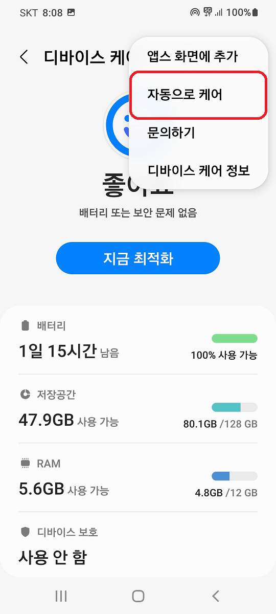 4. 자동으로 케어 메뉴를 클릭합니다.