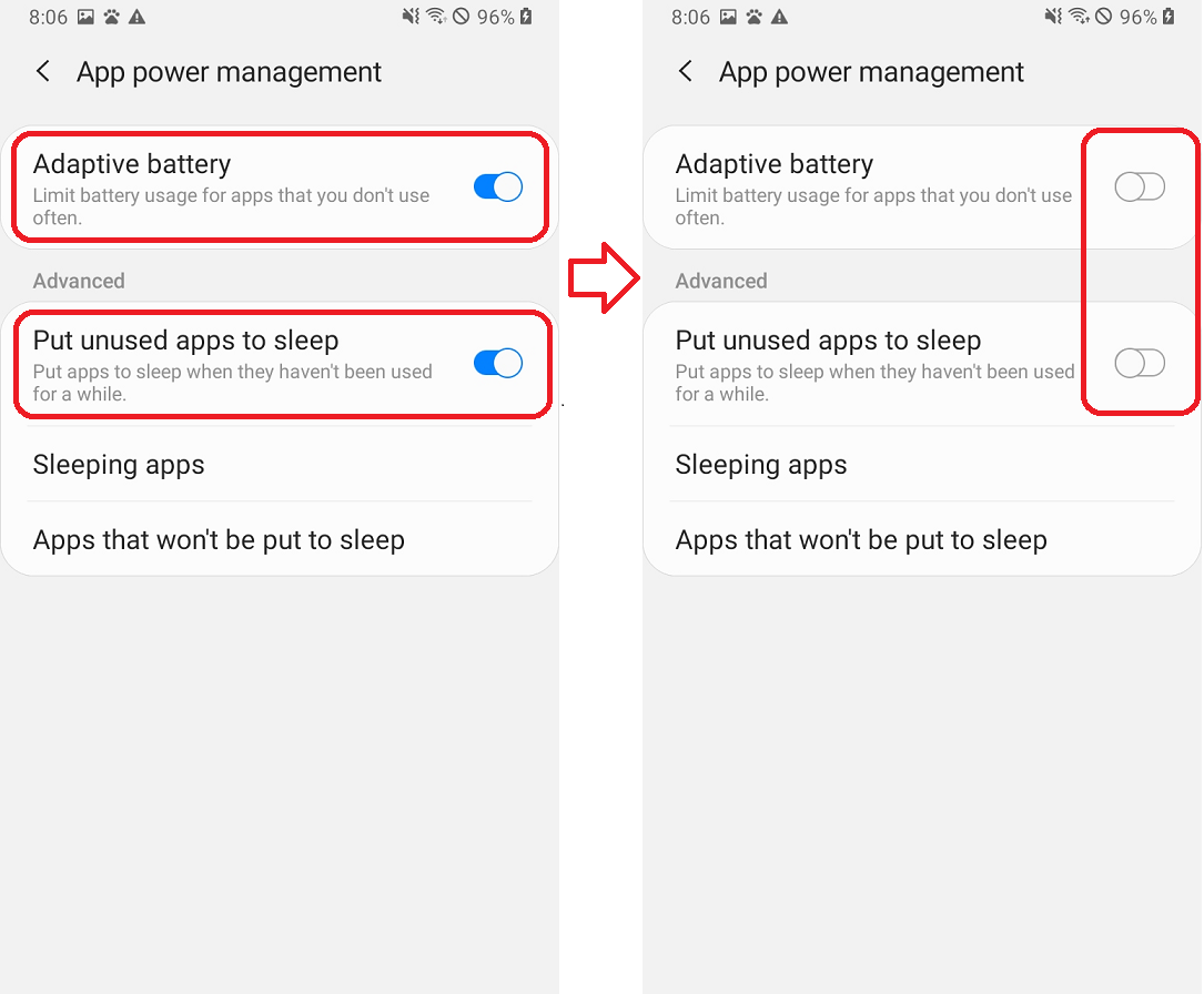 5. Disable "Adaptive battery" and "Put unused apps to sleep. (Please turn it off)